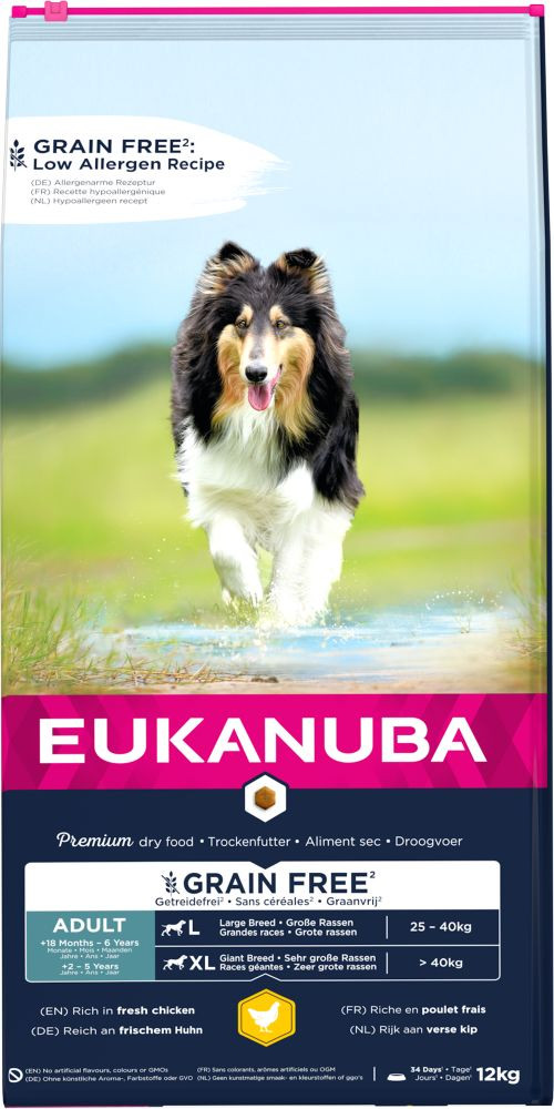 Voeding heeft een grote invloed op de gezondheid van uw hond. U kunt uw viervoeter hierbij ondersteunen door een hoogwaardige hondenbrok te kiezen. Eukanuba Adult Large kip graanvrij hondenvoer is speciaal samengesteld voor volwassen honden van grote rassen vanaf 18 maanden (of vanaf 2 jaar voor zeer grote rassen). Uiteraard bevat de voeding alle belangrijke voedingsstoffen, vitaminen en antioxidanten die uw hond nodig heeft om gezond en fit te blijven. Het bevat een laag allergeengehalte, is rijk aan verse kip, en daarnaast zorgvuldig ontwikkeld voor honden met gevoeligheden voor graan. De hoogwaardige dierlijke eiwitten dragen bij aan de opbouw en het behoud van sterke, vetvrije spieren. Speciaal voor de gewrichten en botten van uw grote hond, is er een aangepast calciumgehalte en extra glucosamine toegevoegd. Zo blijft uw grote vriend zo lang mogelijk vitaal en sterk.
