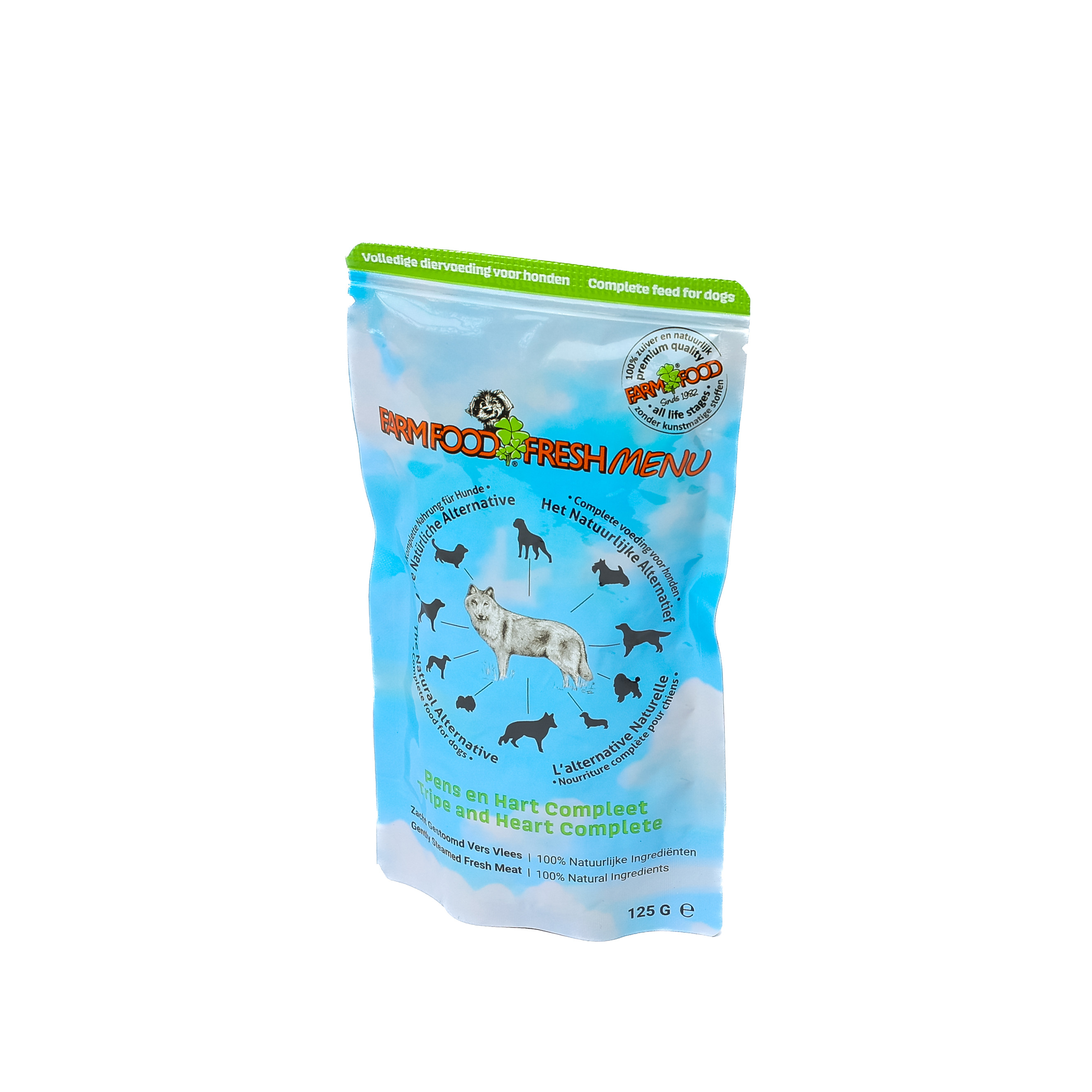 Farm Food Fresh Menu runderpens met hart natvoer hond (zakjes 125 gram) is een complete en natuurlijke hondenvoeding en is geschikt voor honden van alle rassen en leeftijden. Met dit hoogwaardig product haalt u een een glutenvrij, zachtgestoomd vers vlees menu voor uw hond in huis. Hiermee geeft u uw hond een natuurlijke, smakelijke en complete maaltijd. Farm Food Fresh Menu met pens en hart nat hondenvoer bevat geen bot of gevogelte en is samengesteld met dierlijke ingrediënten die in eerste instantie zijn goedgekeurd voor menselijke consumptie. Zo weet u zeker dat uw hond enkel de allerbeste ingrediënten van de hoogste kwaliteit binnenkrijgt. Dit product van Farm Food bevat eveneens prebiotica, waardoor de darmflora van uw hond gezond blijft. U kunt dit product buiten de koelkast bewaren. De voeding kan ook als aanvulling op of als alternatief voor diepvriesvlees gegeven worden.
