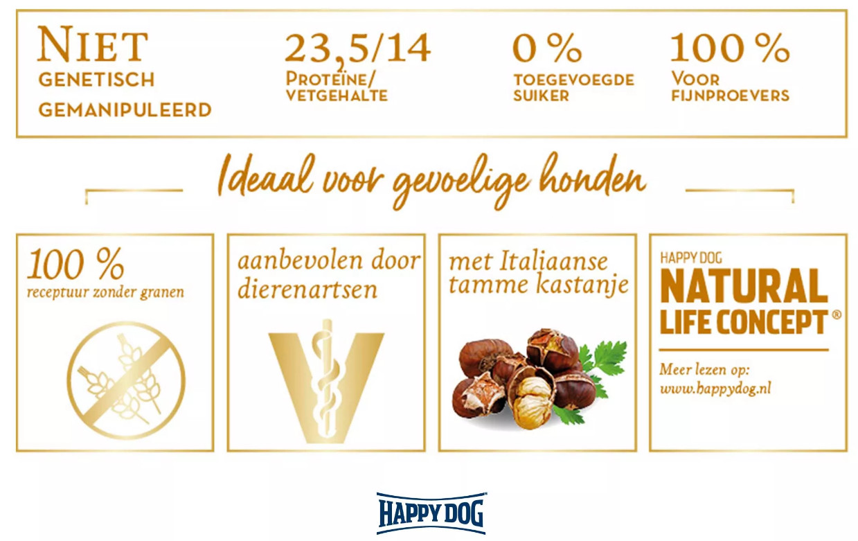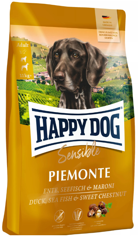 Happy Dog Supreme Sensible Piemonte hondenvoer is voor de gevoelige volwassen hond met een voedselintolerantie of allergie. Het voer is glutenvrij, graanvrij en zonder aardappel. Met goed verteerbare eend, heerlijke zeevissen en Italiaanse kastanjes.