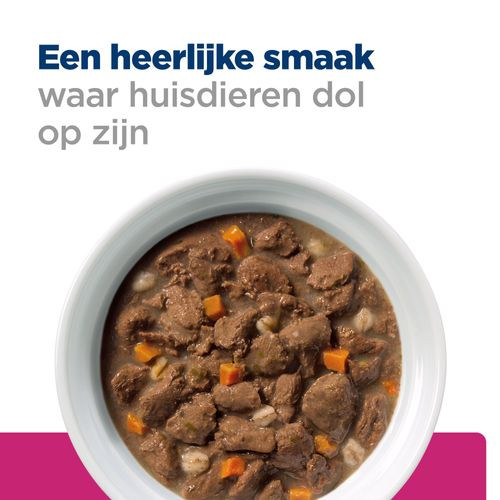 Hill's Prescription Diet Gastrointestinal Biome Digestive Care stoofpotje voor hond is een speciale dieetvoeding ter vermindering van acute intestinale absorptiestoornissen en ter compensatie van een slechte spijsvertering bij honden.