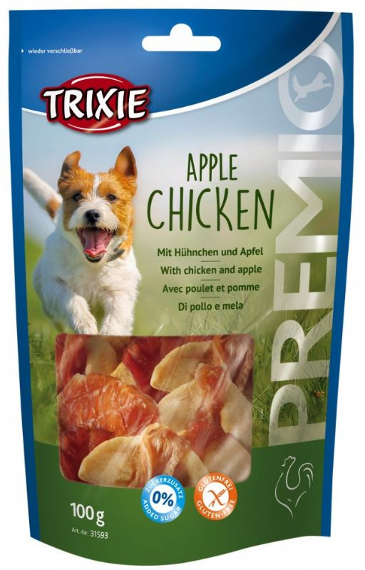 Trixie Premio Apple Chicken is een heerlijke traktie voor uw hond van gedroogde kip en appel. Met een vleesgehalte van 61%. Een verpakking bevat 100 gram in een hersluitbare zak.