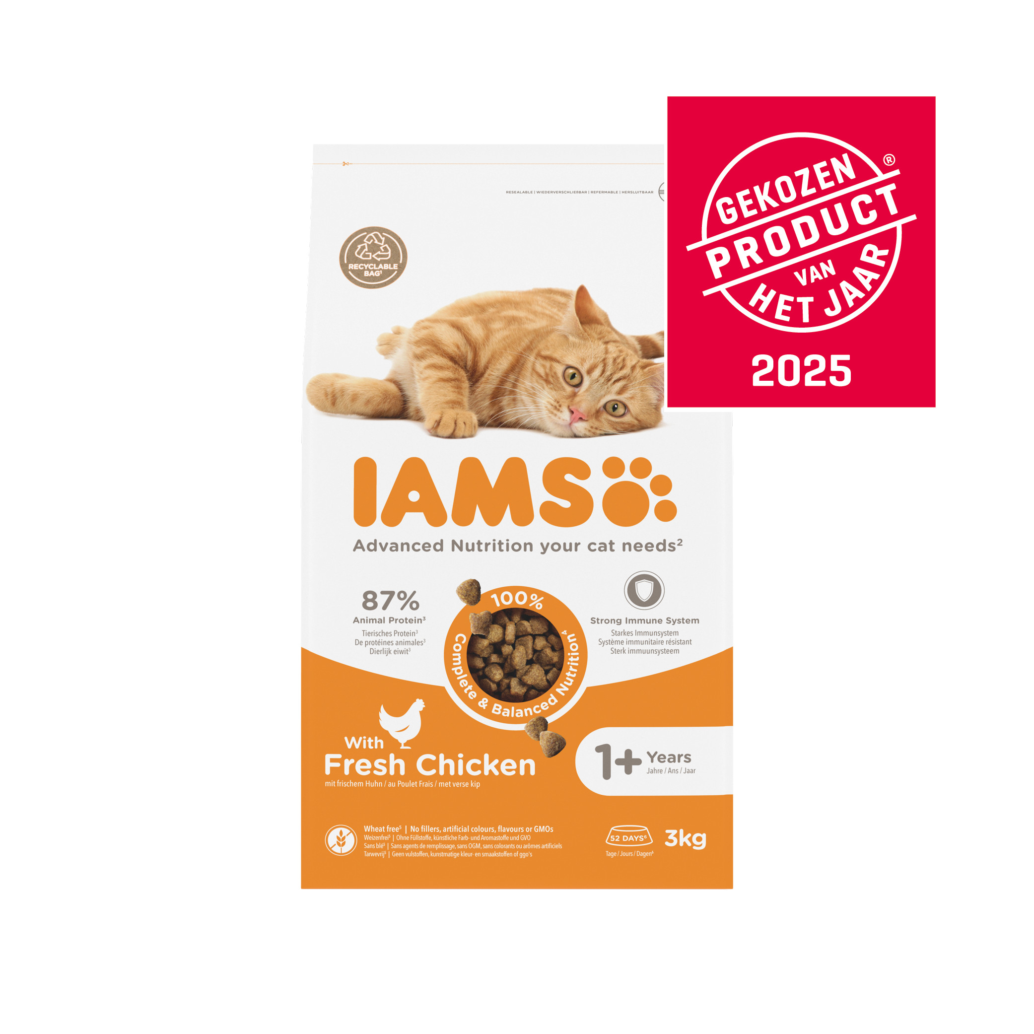 Iams Adult kattenvoer met verse kip is een complete en uitgebalanceerde voeding om de gezondheid en vitaliteit van uw kat optimaal te ondersteunen. Deze brokjes bevatten maar liefst 87% dierlijk eiwit, waarmee aan de natuurlijke behoefte van katten wordt voldaan. Verder bevat dit droogvoer met verse kip een mix van antioxidanten met vitamine E ter ondersteuning van het immuunsysteem van uw trouwe kat. Daarnaast is het verrijkt met omega 3 en omega 6 ter ondersteuning van een gezonde huid en een glanzende vacht. Om de gezondheid van de hartspier te ondersteunen is taurine toegevoegd. Alle IAMS-producten voor volwassen katten bevatten een aangepast vezelmengsel met prebiotica en bietenpulp ter bevordering van een gezonde spijsvertering.