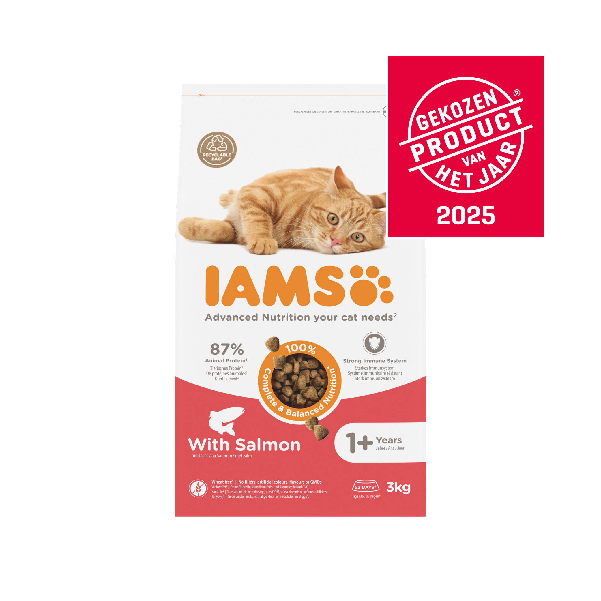 Iams Adult kattenvoer met zalm is smakelijk en 100% compleet droogvoer voor katten vanaf 1 jaar. Verwen uw kat met de onweerstaanbare smaak van zalm, terwijl de knapperige brokjes ook bijdragen aan de tandgezondheid.