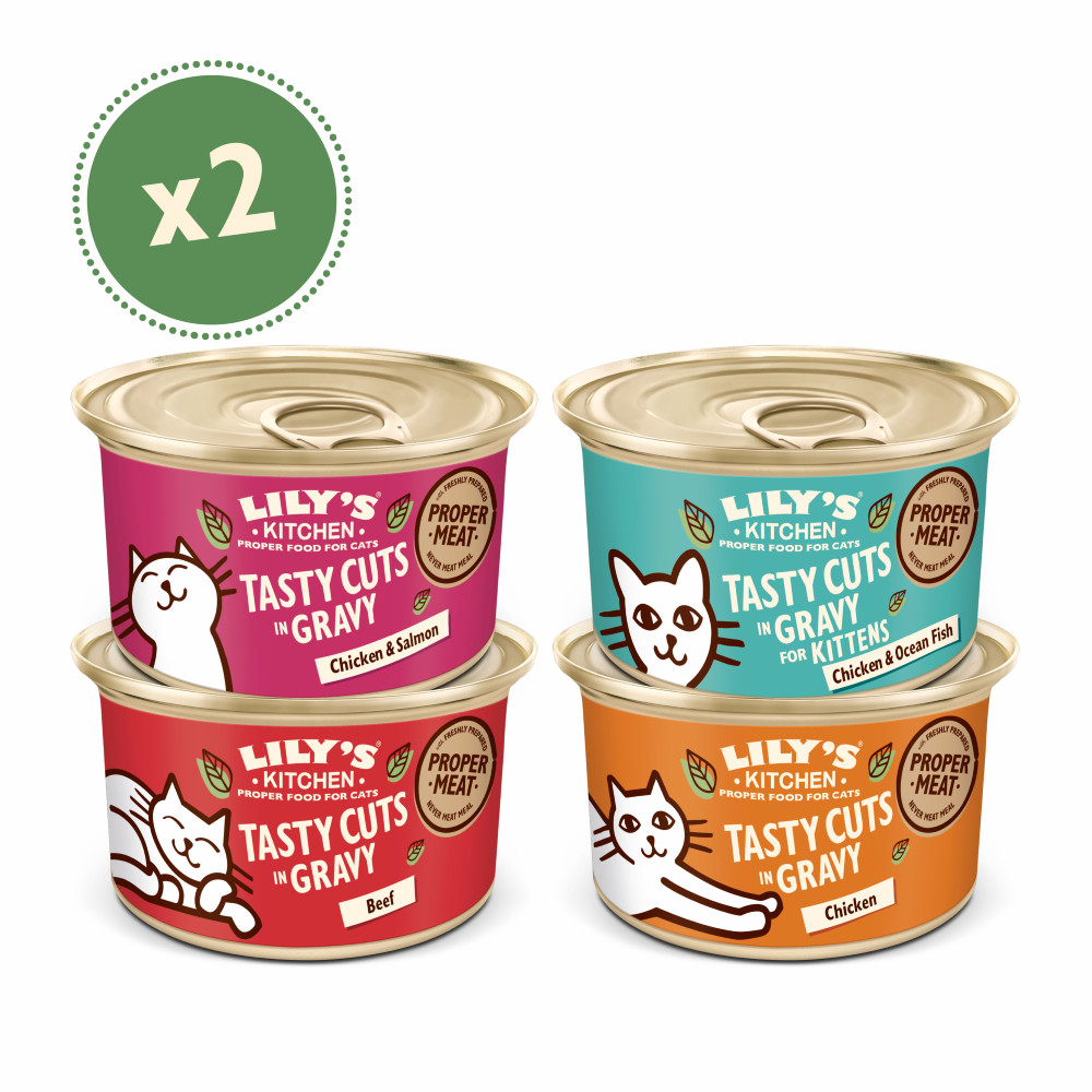 Zoekt u een volledige en uitgebalanceerde maaltijd voor uw kat? Lily's Kitchen Cuts in gravy kip, zeevis, kip met zalm, rund natvoer kat is gebaseerd op een graanvrij recept, zonder toegevoegde suikers. De natuurlijk ingrediënten bestaan uit hoogwaardige stukjes vlees of vis in een rijkelijke saus. In deze multipack vindt u de smaken kip, oceaanvis, rund en kip met zalm. Met Lily's Kitchen multipack wisselt u eenvoudig af tussen verschillende smaken. Ondanks dat Lily's Kitchen bestaat uit complete voedingen, is het zeer aan te raden de verschillende voedingen met elkaar af te wisselen, zowel droog- als natvoer. Het wisselen tussen varianten helpt het immuunsysteem wakker te houden en zorgt bovendien voor een gevarieerd dieet.