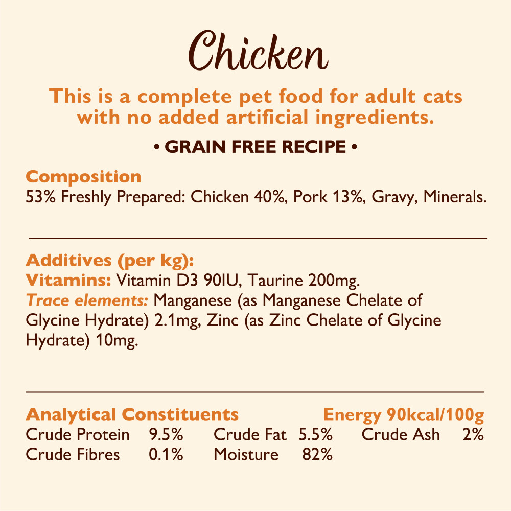Kip met zalm: Ruw eiwit 9,5%, Ruw vet 6%, Ruwe celstof 0,1%, Ruwe as 2%, Vocht 82%