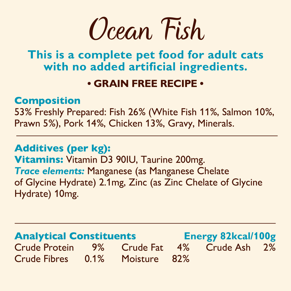 Witte vis, zalm & garnaal (oceaanvis): Varkensvlees (14%), Kip (13%), Witte vis (11%), Zalm (10%), Garnaal (5%), Mineralen.