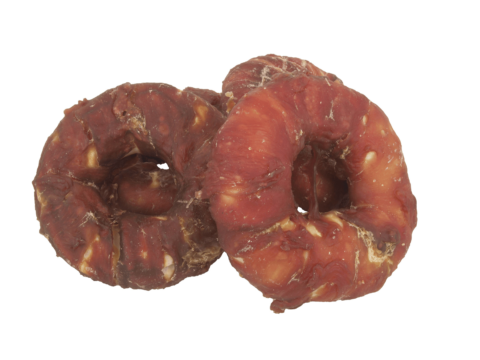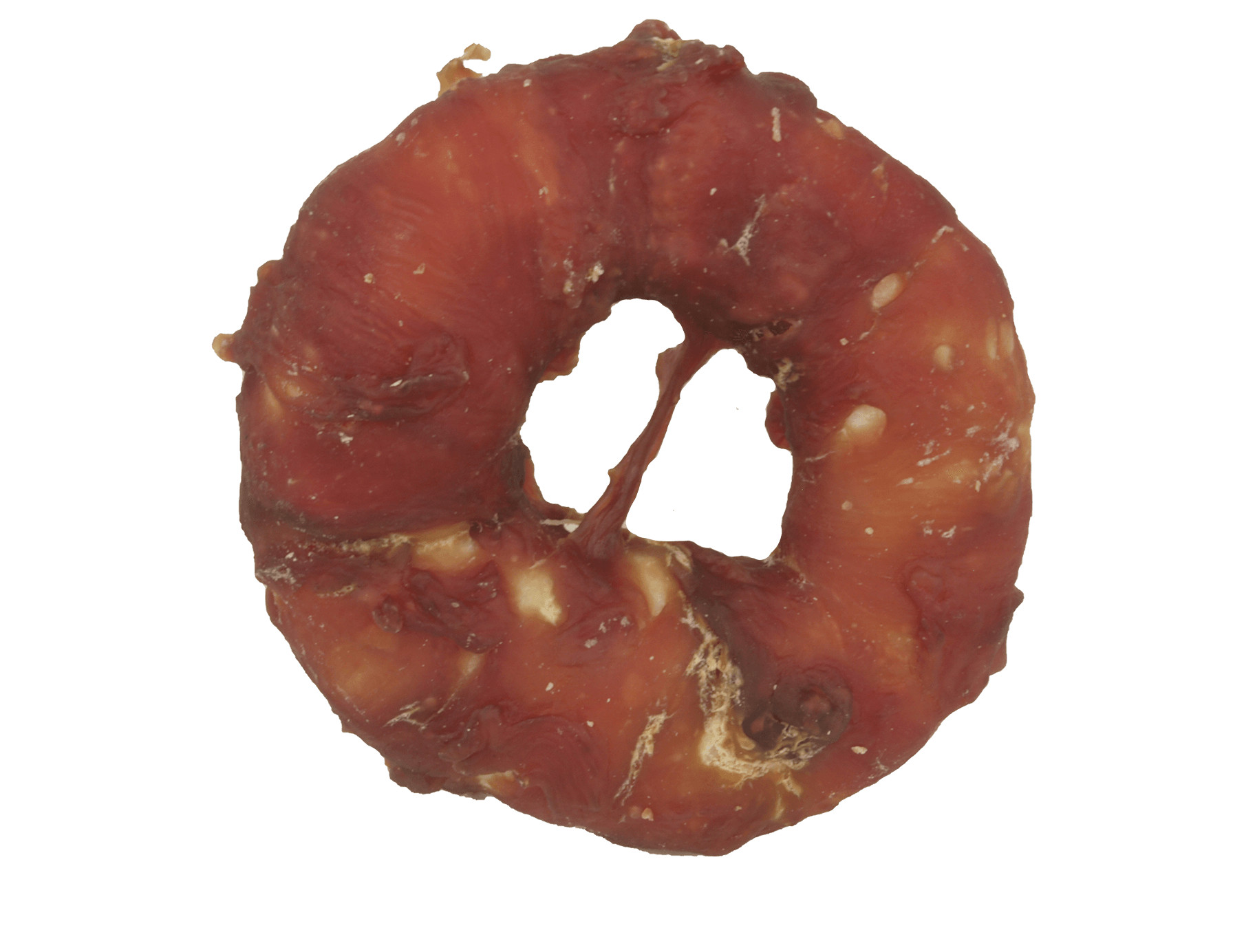 Rawhide Donut met eend kauwsnack voor honden is een kauwring van witte runderhuid (rawhde) gewikkeld in gedroogde eend en per stuk verpakt. De donut is vrij van toegevoegde suikers.