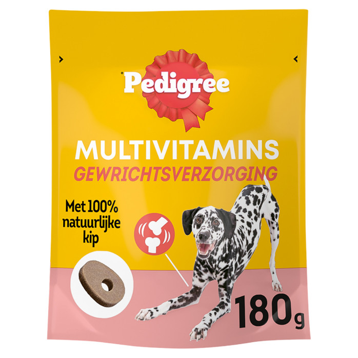 Pedigree Multivitamins Joint Care is bedoeld voor volwassen honden die extra ondersteuning kunnen gebruiken voor hun gewrichten. Dit kan zowel nuttig zijn voor oudere honden, als rassen die vatbaar zijn voor gewrichtsproblemen. De smakelijke snack is gemaakt met kip en bevat geen kunstmatige kleur- of smaakstoffen. Met minder dan 5% vet kunt u uw hond verwennen zonder u direct zorgen te hoeven maken over ongewenste gewichtstoename.