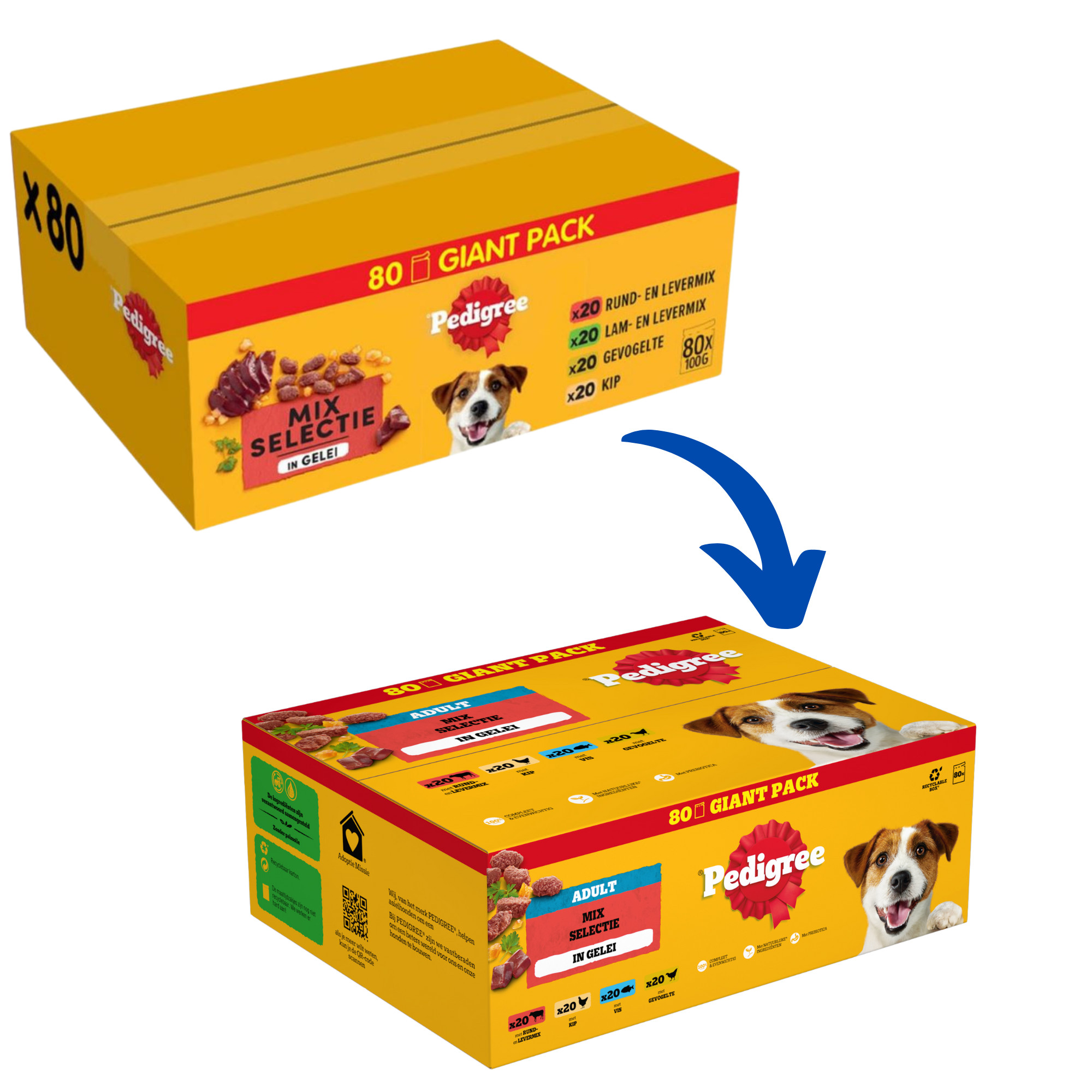 Pedigree Adult Selectie in gelei multipack natvoer hond bevat 4 verschillende smaken nat hondenvoer voor volwassen honden. Zo geniet uw hond de ene dag van een overheerlijke kipsmaak en geeft u de andere dag een lekkere maaltijd met gevogelte, rund óf vis. De combiverpakking bevat maar liefst 80 verschillende maaltijdzakjes en is verpakt in 100% recyclebaar karton.