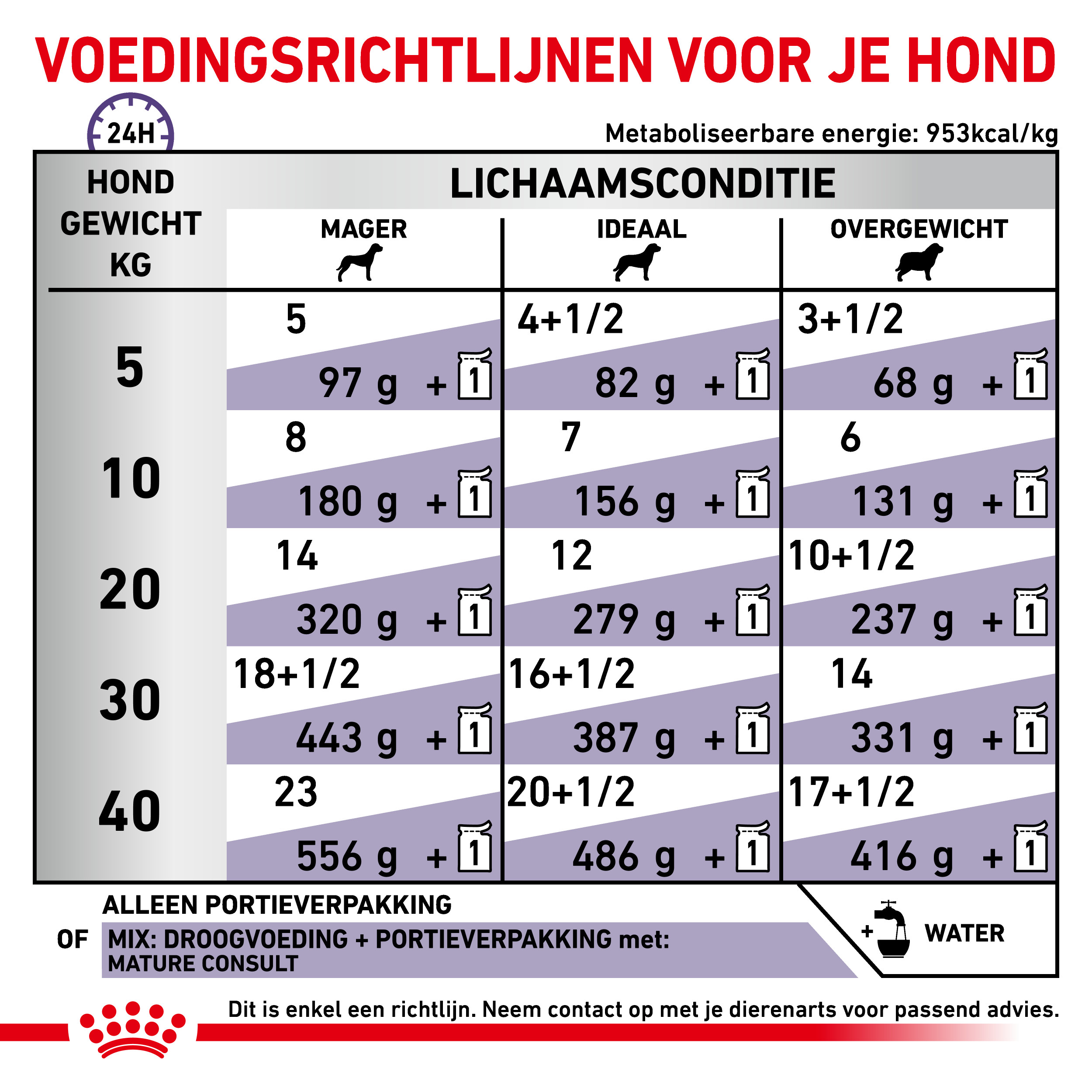 Zorg altijd voor voldoende drinkwater bij het voer. Bewaar het voer op een droge plek en sluit het goed af. Na openen koel en goed afgedekt bewaren en binnen 48 uur gebruiken. De houdbaarheid van Royal Canin Expert Mature Consult natvoer hond staat op de verpakking vermeld en is veelal voldoende wanneer u zich houdt aan het aanbevolen gebruik.