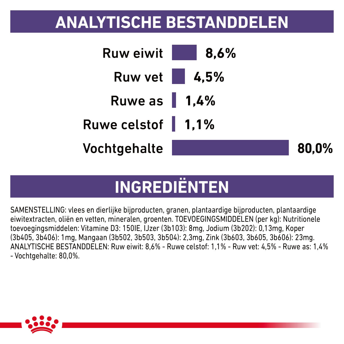 Dit natvoer bevat een zorgvuldig samengestelde mix van voedingsstoffen, een zogenaamd ‘vitaliteitscomplex’, dat de belangrijke organen van uw hond ondersteunt, waaronder de nieren en het hart. Daarnaast bevat het hoogwaardige eiwitten die belangrijk zijn voor het behoud van spiermassa, zodat uw hond actief kan blijven, ook op hogere leeftijd. Het natvoer bevat bovendien voedingsstoffen die bijdragen aan een gezonde huid en glanzende vacht, wat het welzijn en het uiterlijk van uw hond ten goede komt. Ook bevordert het voer een gezond milieu in de urinewegen, wat van belang is voor oudere honden die vatbaarder zijn voor urinewegproblemen. Royal Canin Mature Consult biedt zo een volwaardige en smakelijke voeding die uw hond helpt om comfortabel en gezond ouder te worden.