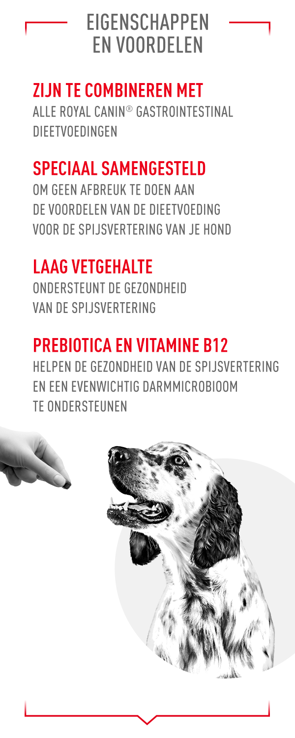 Royal Canin Gastrointestinal Treats hondensnack zijn heel geschikt voor honden ouder dan 3 maanden, die een Gastrointestinal dieetvoeding krijgen.