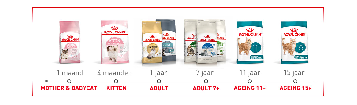 Voor oudere katten kunt u ook kiezen voor Royal Canin Ageing 11+ kattenvoer of Royal Canin Ageing Sterilised 11+. Op de pagina van Royal Canin kunt u een zeer ruim aanbod vinden met droogvoedingen voor katten in verschillende levensfasen!