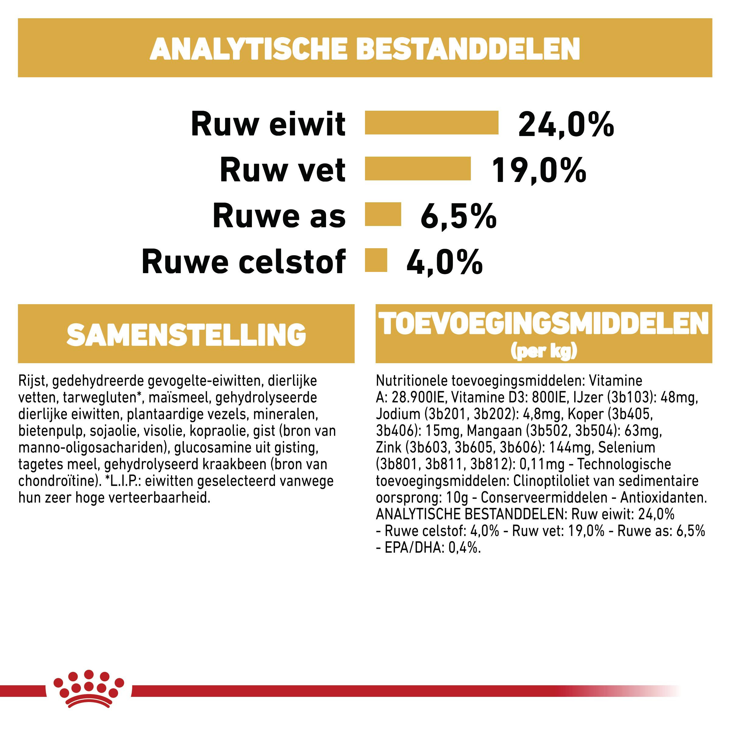 Samenstelling: Rijst, gedehydreerde gevogelte-eiwitten, dierlijke vetten, isolaat van plantaardige eiwitten*, maïsmeel, plantaardige vezels, hydrolysaat van dierlijke eiwitten, mineralen, bietenpulp, sojaolie, visolie, kopraolie, gehydrolyseerde gist (bron van Manno-Oligo-Sacchariden), hydrolysaat van schaaldieren (bron van glucosamine), extracten uit groene thee en druiven (bron van polyfenolen), tagetes (Afrikaan) extract (bron van luteïne), hydrolysaat van kraakbeen (bron van chondroïtine)