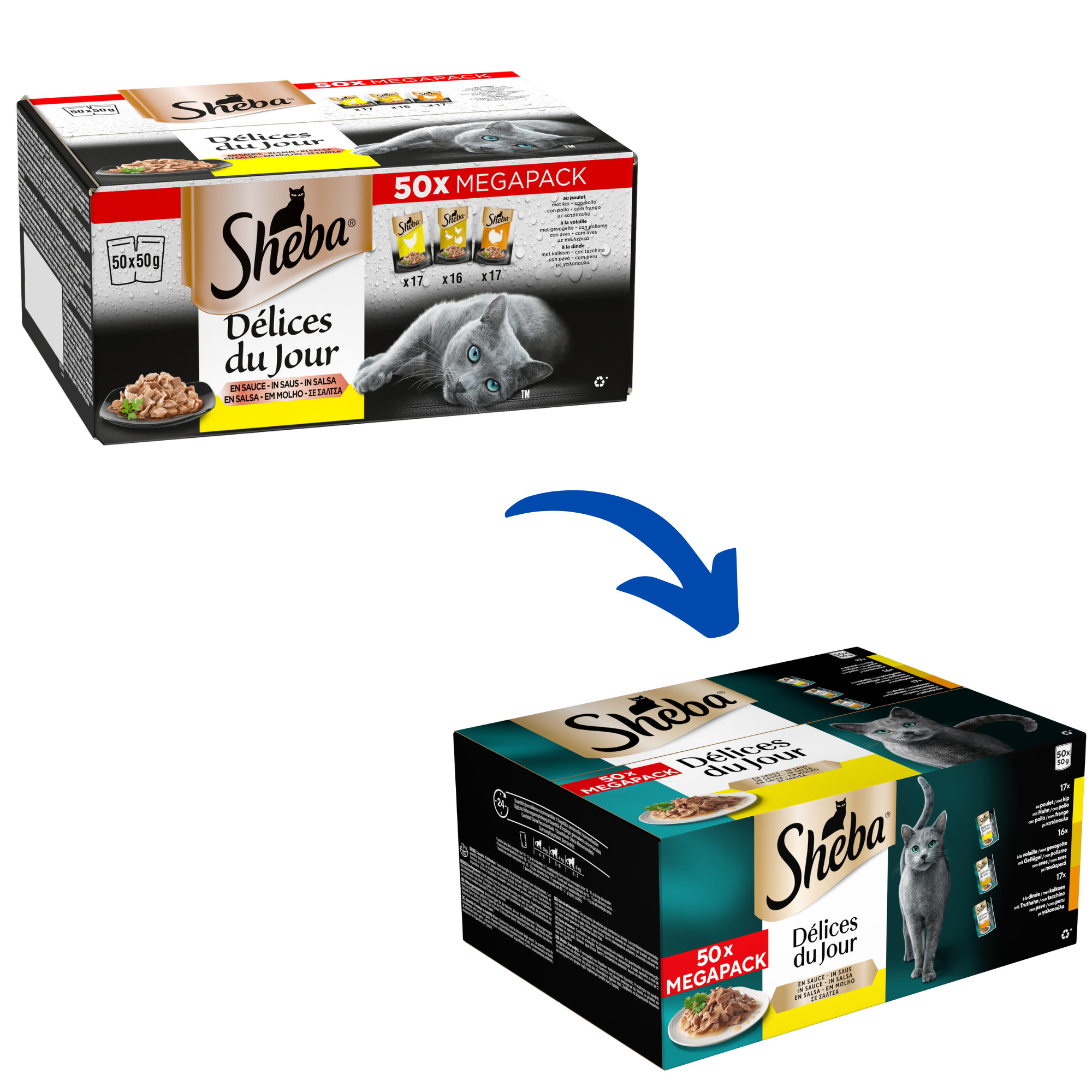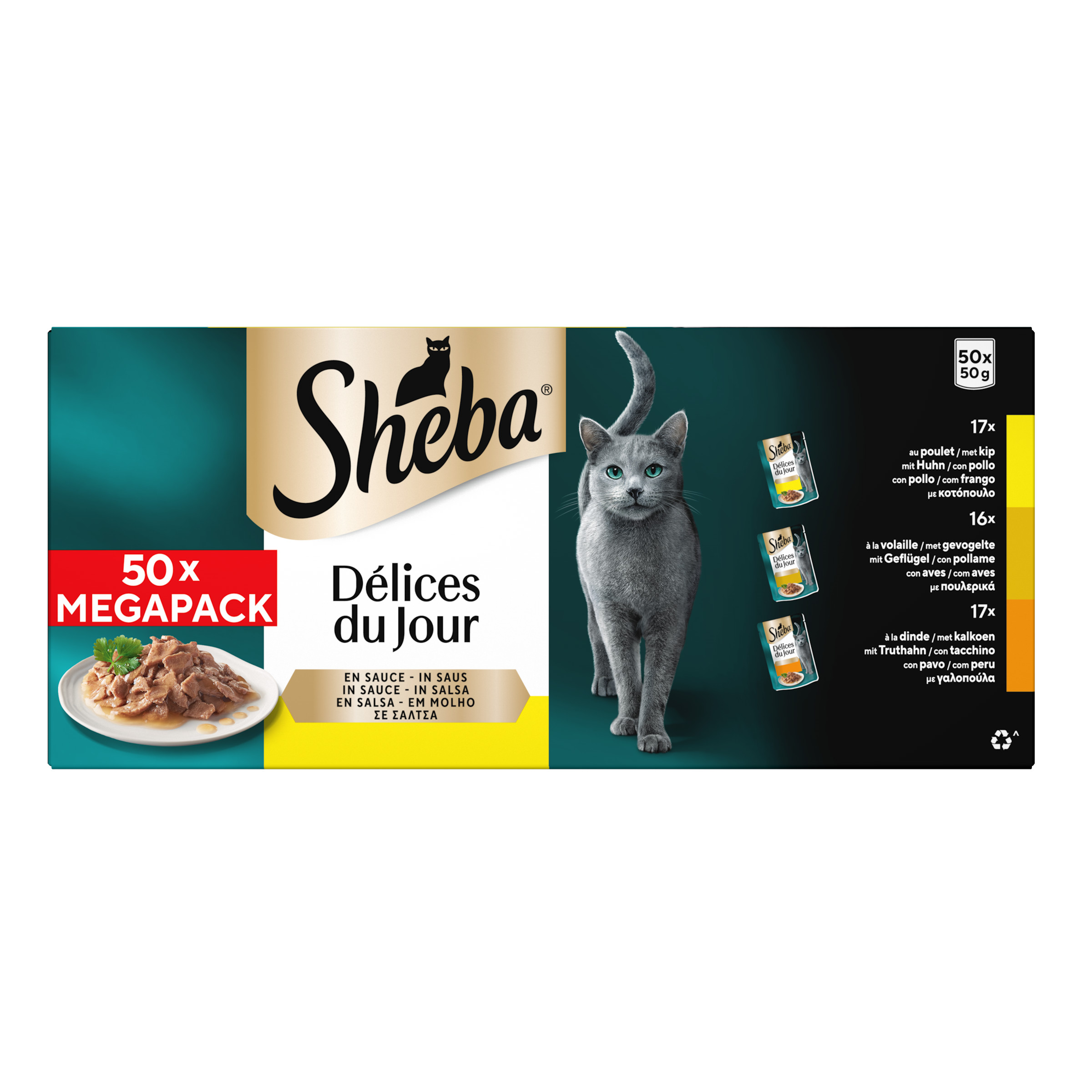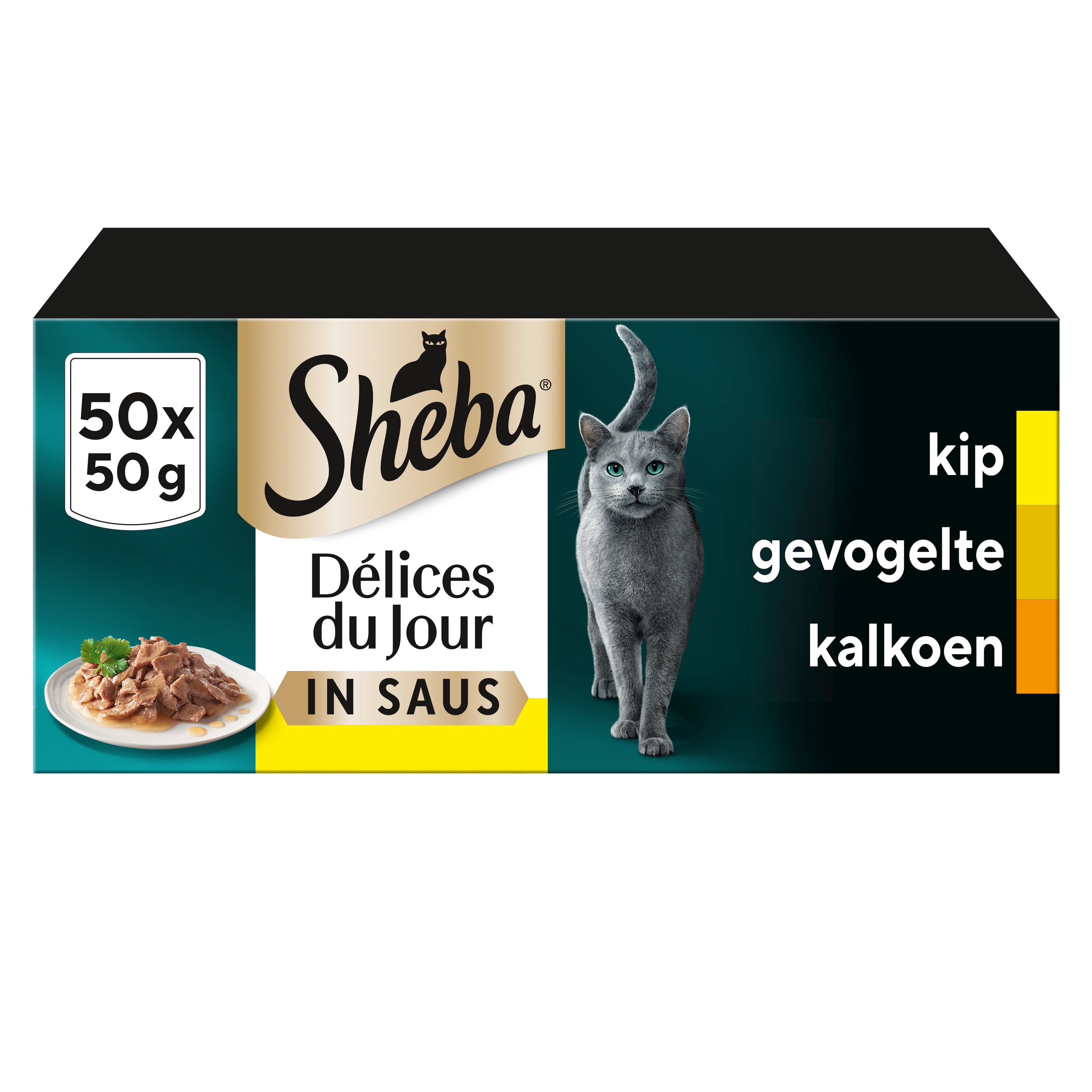 Sheba Délices du Jour met kip, kalkoen en eend in saus is een mix van malse reepjes gevogelte in een smakelijk saus. Eén portie bevat 50 gram.
