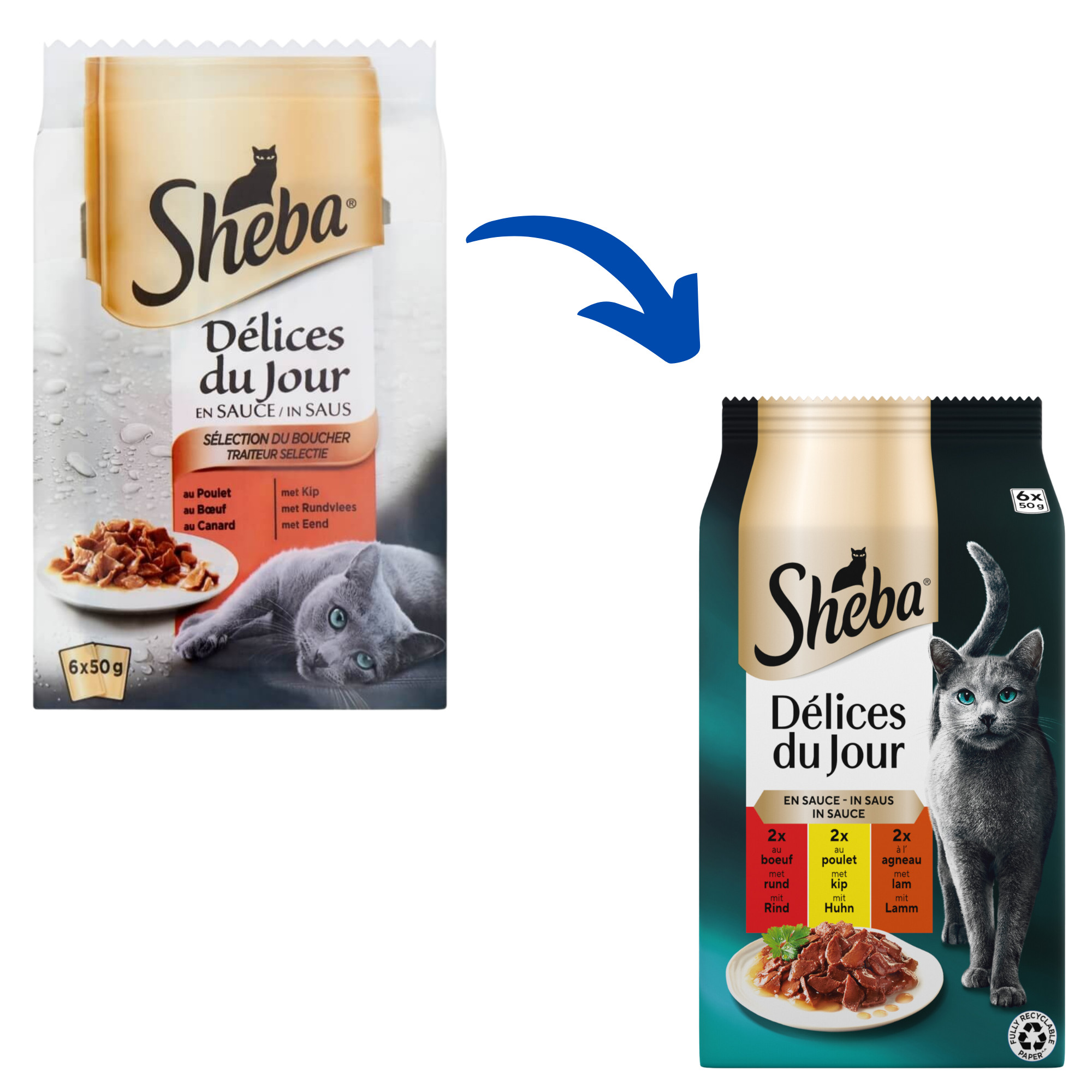 Sheba Délices du Jour met rund, kip en lam in saus natvoer kat bestaat uit fijne stukjes vlees in een smakelijke saus. Geserveerd in kleine porties van 50 gram.