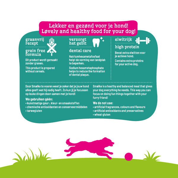 Smølke Adult graanvrij hondenvoer is een uitgebalanceerde alles-in-één voeding met natuurlijke ingrediënten voor actieve volwassen honden van alle rassen en is samengesteld zonder granen.