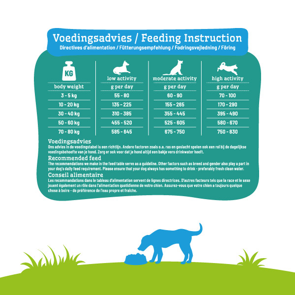 | Gewicht hond | Hoeveelheid voer bij lage activiteit | Hoeveelheid voer bij normale activiteit | Hoeveelheid voer hoge activiteit |