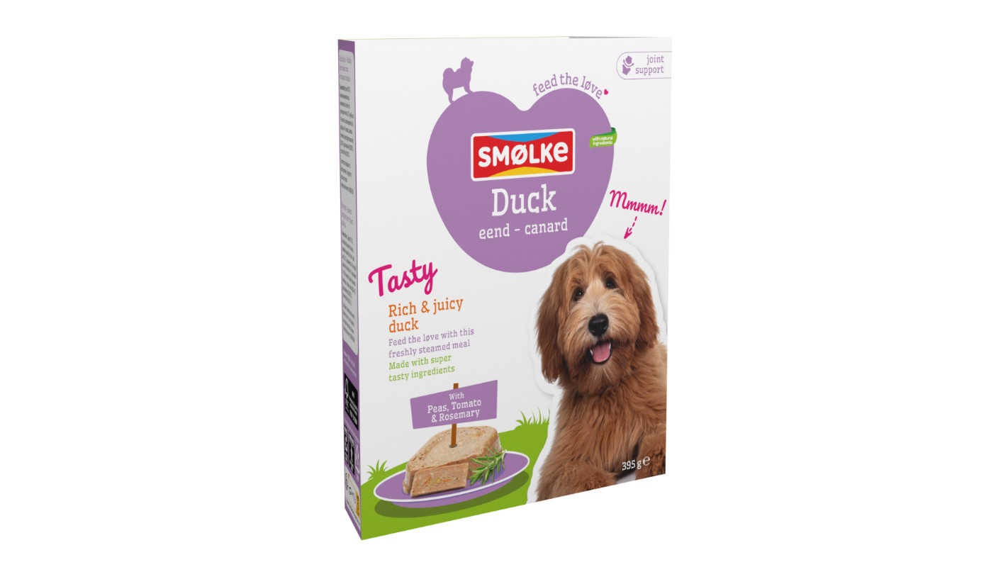 Smølke Tasty Duck vers gestoomd eend nat hondenvoer is een complete maaltijd gemaakt met verse ingrediënten. Het voer bevat eend als enige dierlijke eiwitbron en is daardoor ook geschikt voor honden met een allergie voor andere dierlijke eiwitten.