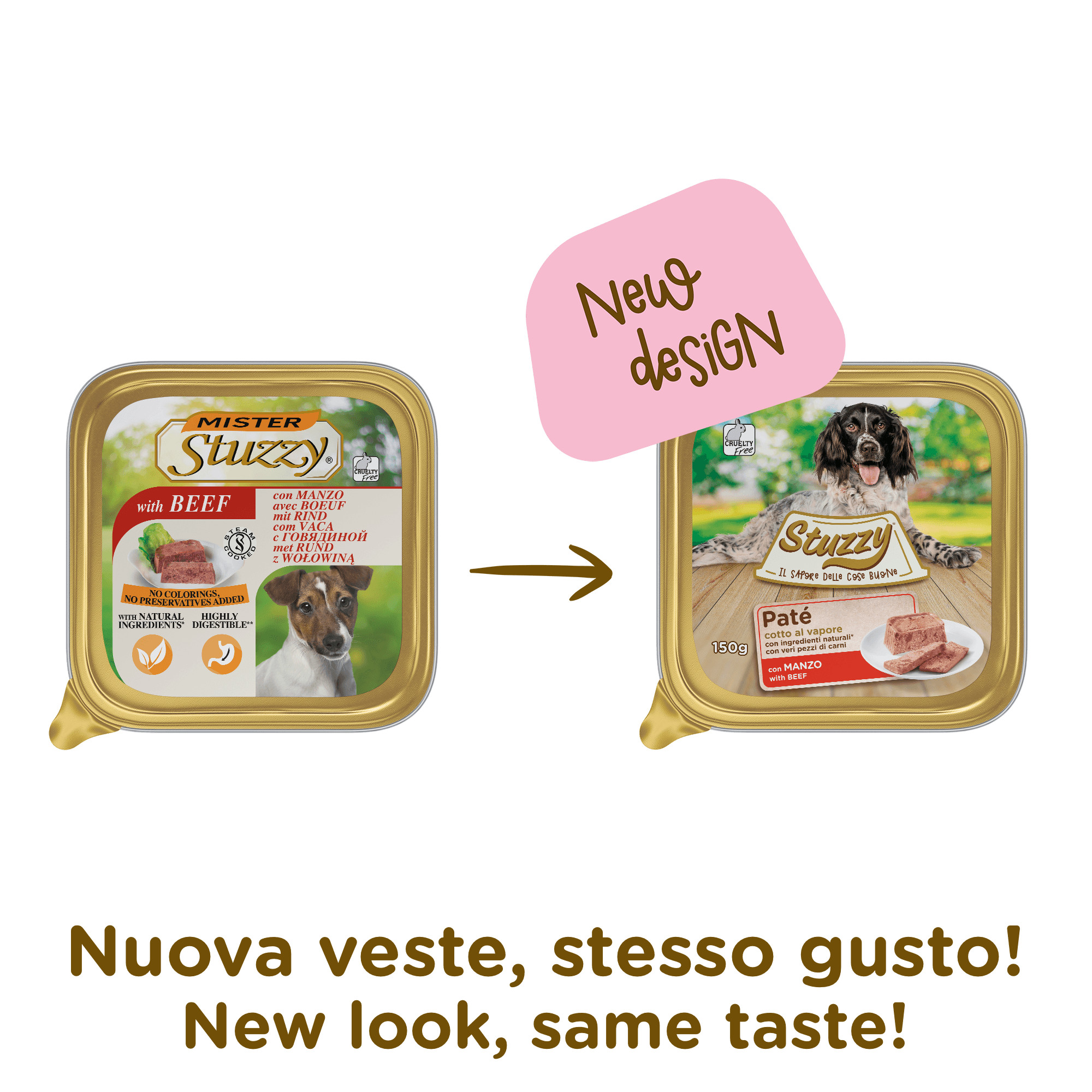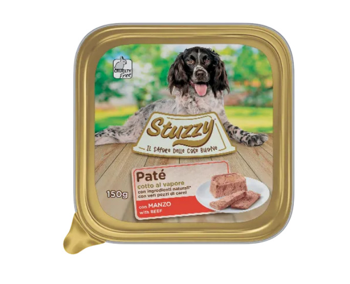 Stuzzy Paté met rund hondenvoer 150 gr. is een smakelijke gestoomde maaltijd met echte stukjes vlees en is geschikt voor volwassen honden.