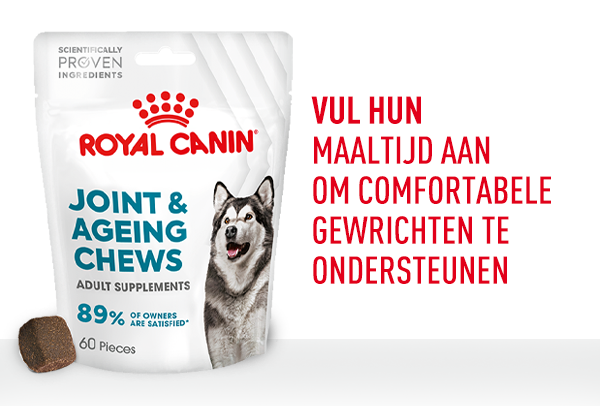 Royal Canin supplementen zijn ontwikkeld om in te spelen op de veranderende behoeften van honden, met wetenschappelijk bewezen ingrediënten ter ondersteuning van hun algehele gezondheid. De effectiviteit van dit supplement wordt bevestigd door gebruikers: 89% van de hondeneigenaren was na twee maanden gebruik tevreden over de Joint & Ageing Chews (interne studie van Royal Canin).