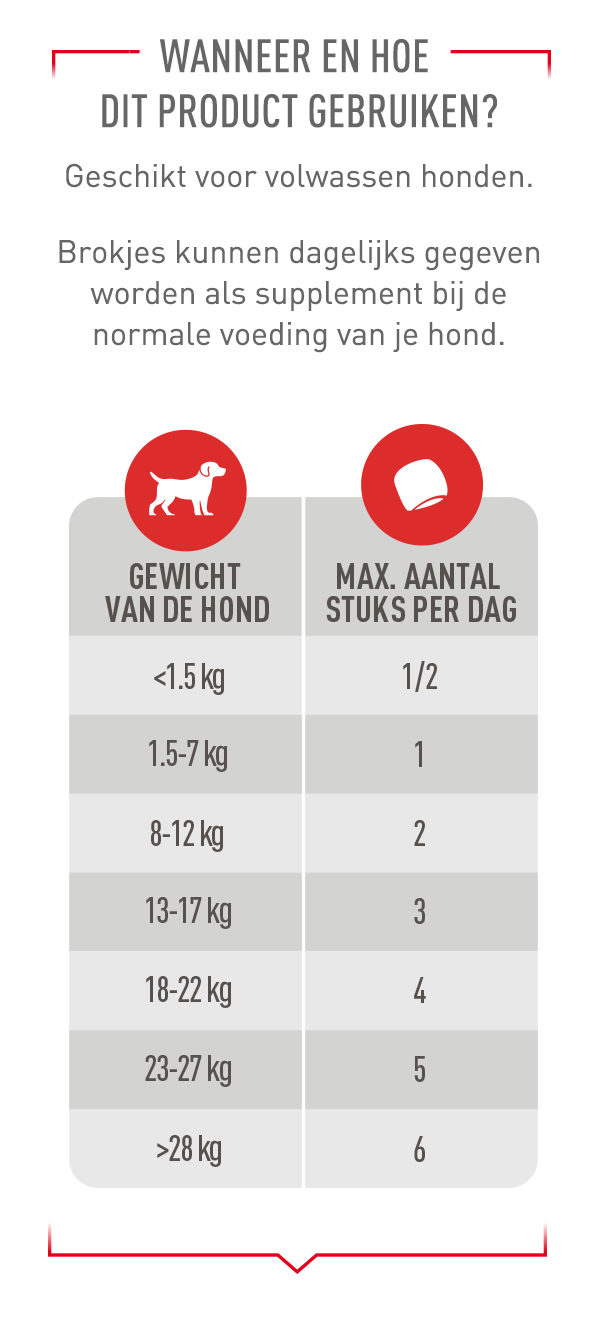 Volg altijd de voedingsrichtlijnen op de verpakking en geef niet meer dan het aanbevolen aantal stuks per dag. Wanneer u snacks of supplementen toevoegt aan het dieet van uw hond, is het belangrijk om de portiegrootte van de hoofdmaaltijd hierop aan te passen. Zo helpt u uw hond een gezond lichaamsgewicht te behouden.