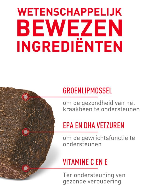 De formule bevat groenlipmossel om te helpen bij het behoud van gezond kraakbeen en een combinatie van de omega-3 vetzuren EPA en DHA, die de gewrichtsfunctie ondersteunen. Daarnaast bevat het supplement een op maat gemaakte mix van ingrediënten, waaronder tomatenpoeder (een natuurlijke bron van lycopeen) en de antioxidanten vitamine C en E, die bijdragen aan het gezond ouder worden van uw hond.