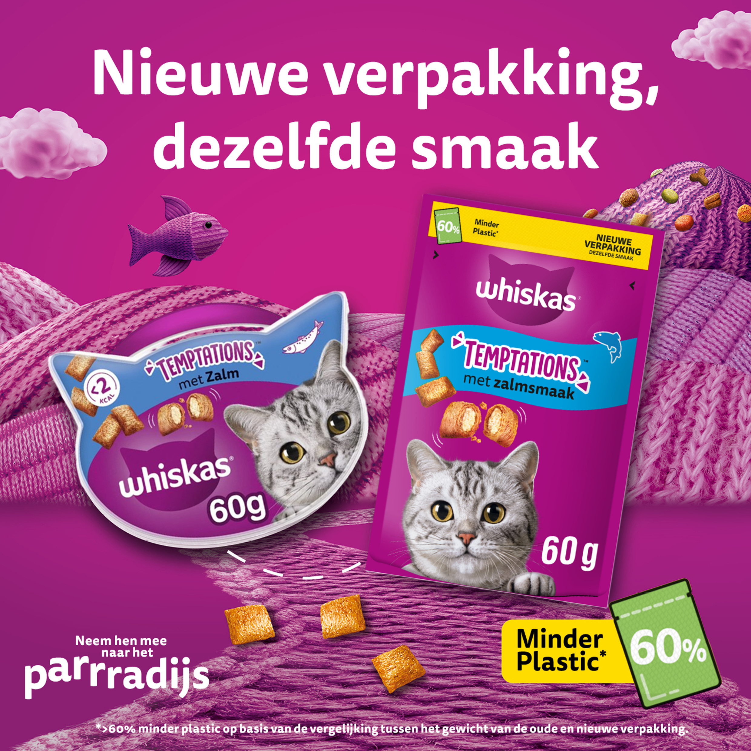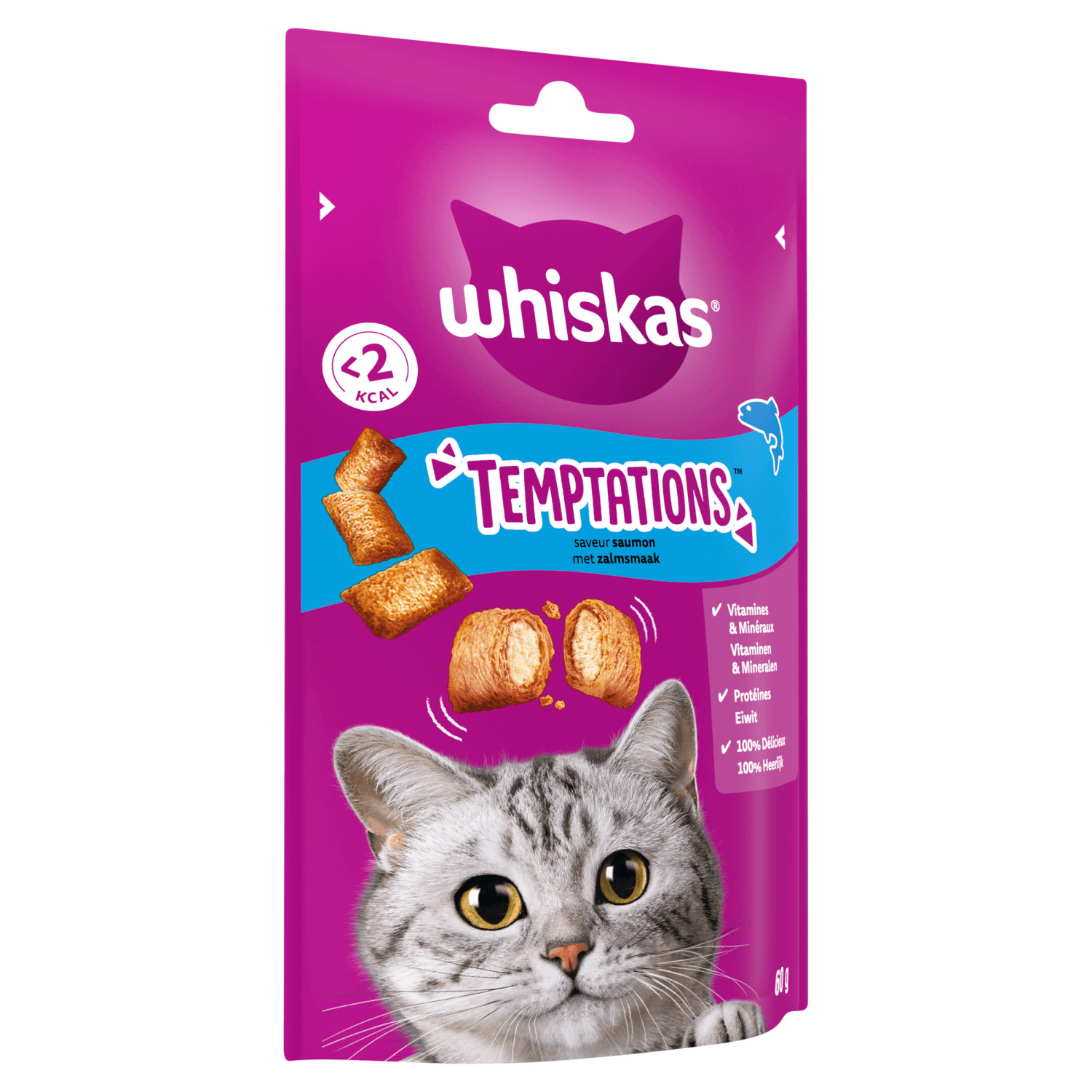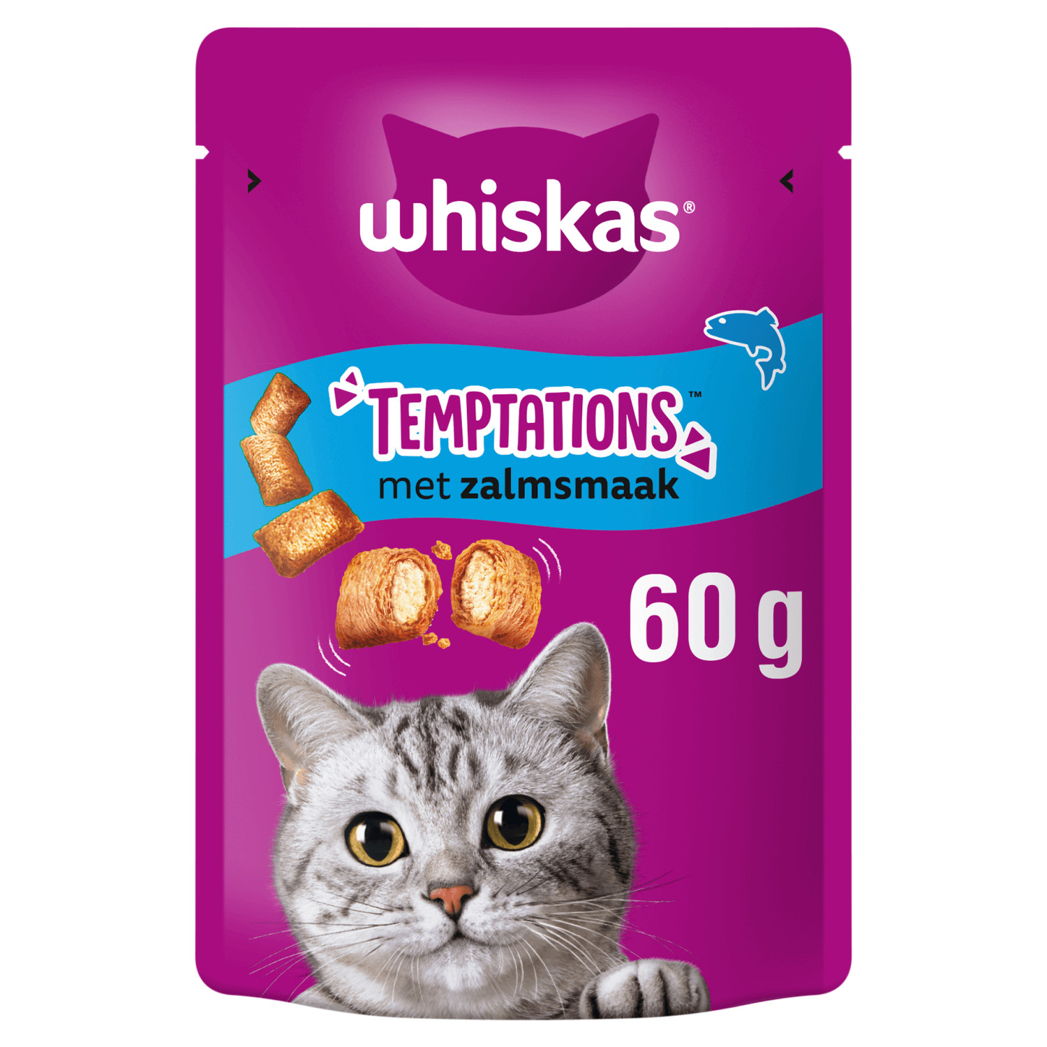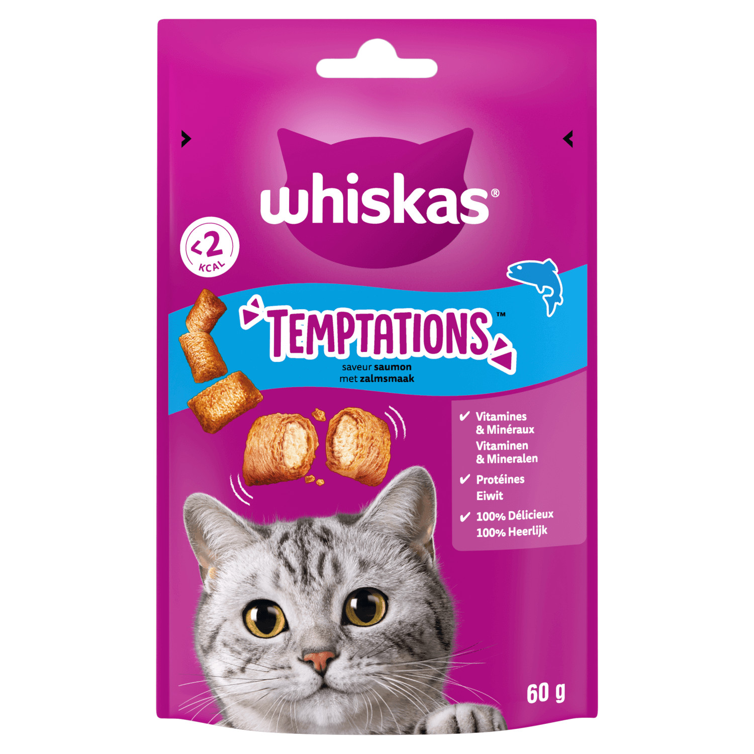 Is Whiskas Temptations met zalmsmaak niet waar u naar op zoek was of is uw kat toe aan afwisseling? Wissel deze variant eens af met bijvoorbeeld Whiskas Temptations met kip en kaas. Voor andere kattensnacks van Whiskas terecht op de pagina met alle Whiskas kattensnacks.